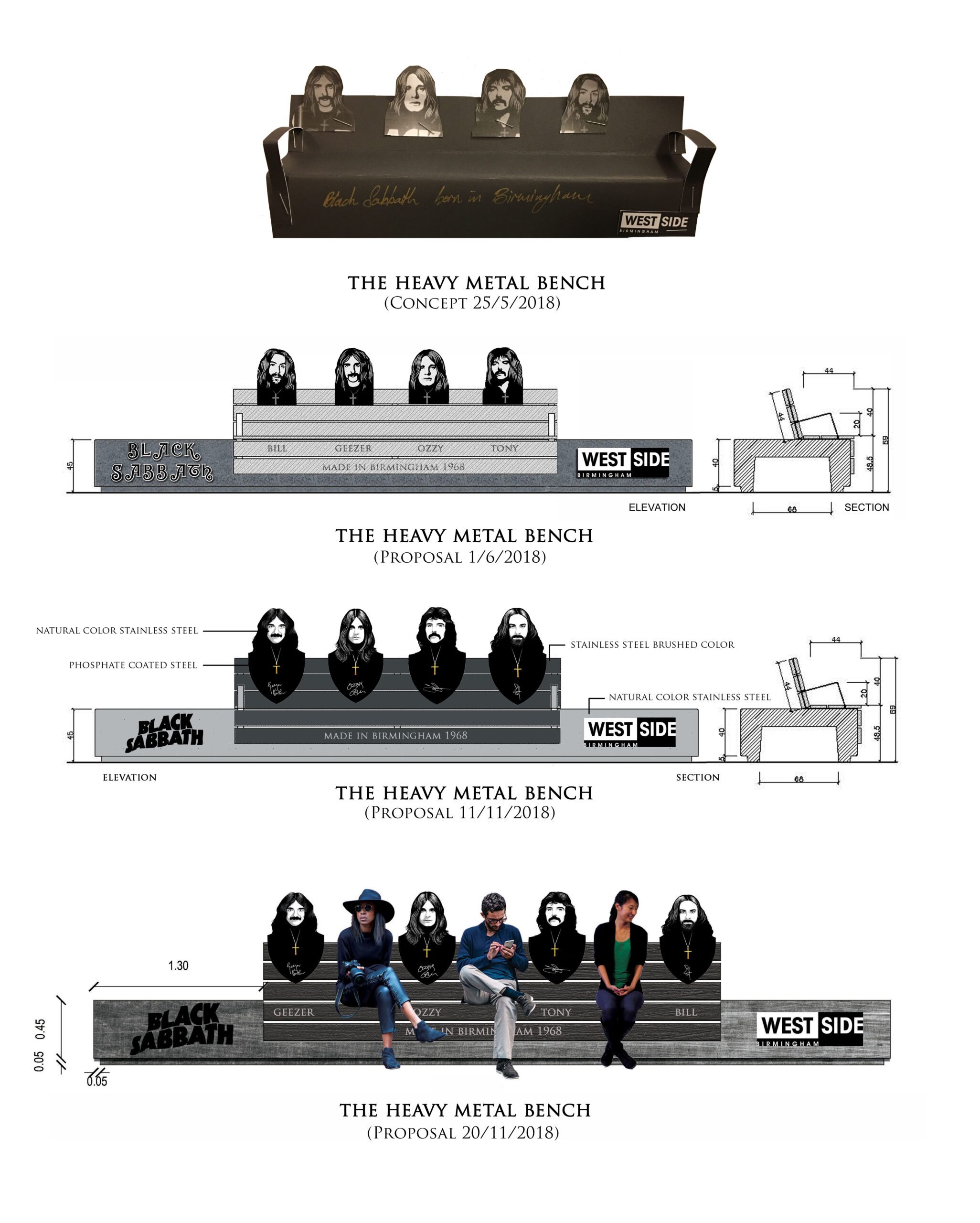 The bench was officially unveiled on the canal bridge, across Broad Street, Birmingham by Black Sabbath’s Toni Iommi, and Geezer Butler on 26 June 2019. Two stars arrived on a barge that took them under the brudge that was shortly to be named after Black Sabbath. The bench was then unveiled in its final place, on Broad Street overlooking the canal. Toni and Geezer were happy to sit on the bench, have pictures taken with fans, and celebrate the new landmark in the city.